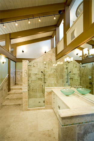 This photograph has appeared in several national and local publications. The shower is outfitted with Grohe faucets. It has two heads, a comfortable bench and a pressure balancing temperature control.