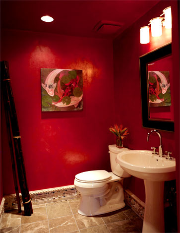 The downstairs Powder Room is a jewel box. The mica mixed with the Venetian plaster instills the red walls with a gold shimmer. Other details comprise classic tile with cut glass, colored stones and sea shells.